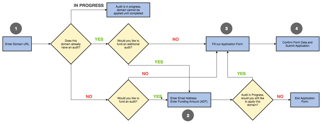 When the user clicks on the + APPLY A DOMAIN button on the MainSideBar, a modal will appear that begins the domain application process. The flowchart below goes through the logic: