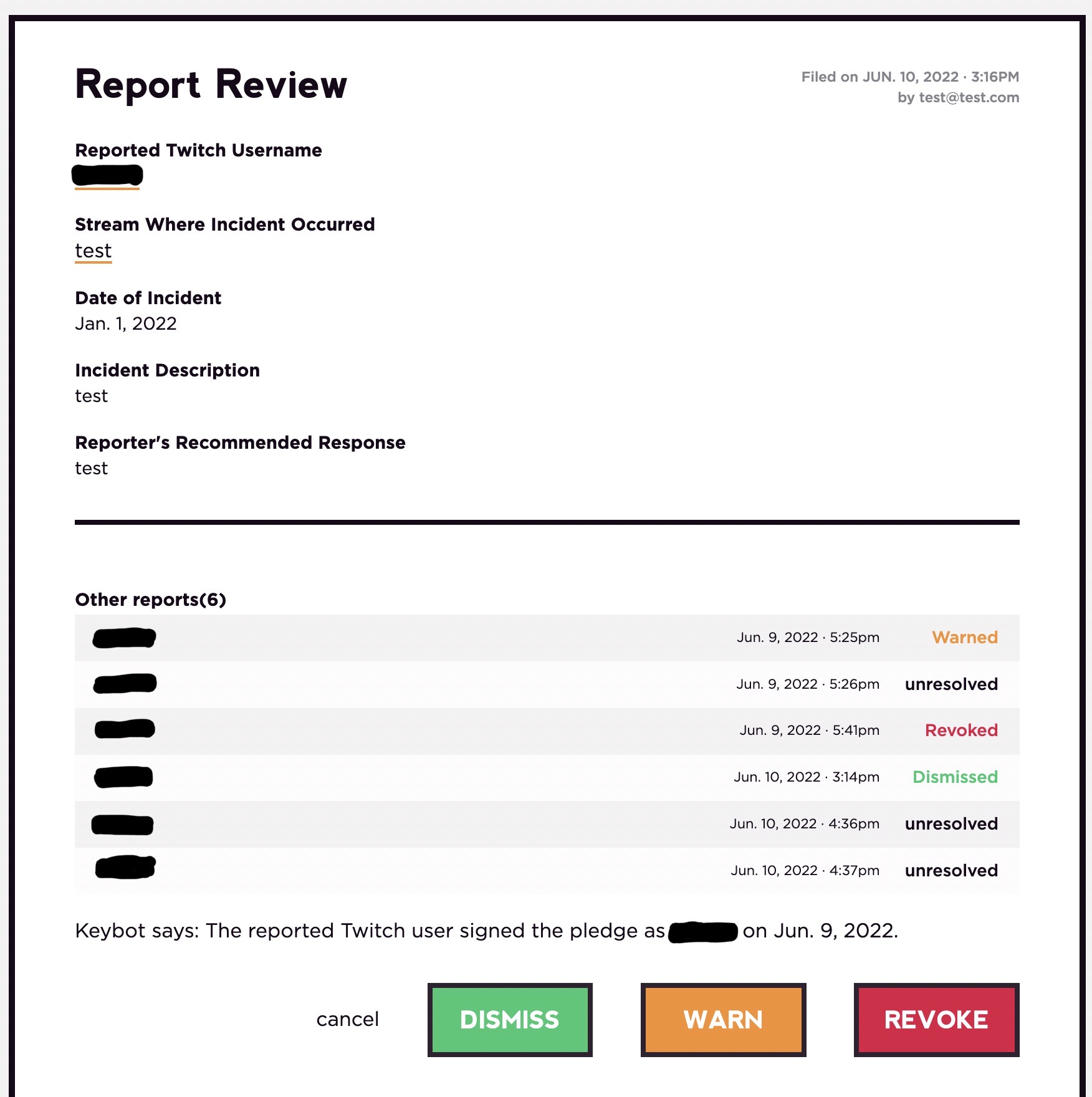 Added "other reports" section to show other reports about the same user. It looks up user based on the twitch id. It also shows the status of the reports (Unsolved / warned / dismissed / revoked )