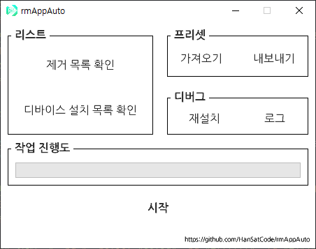| 리스트 | 제거 목록 확인 | View the uninstall list. The uninstall list must be in package format (e.g. com.~). Each app is separated by an line-alignment. The subscript "package:" is deleted when this program is running. The list is stored in 'remove_list.txt'. |