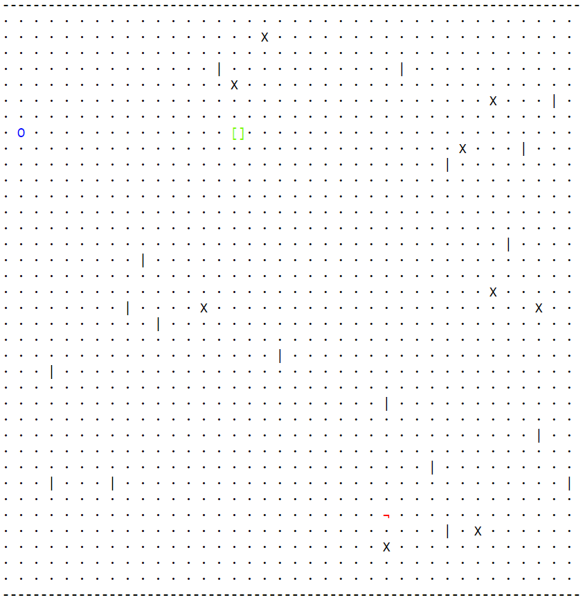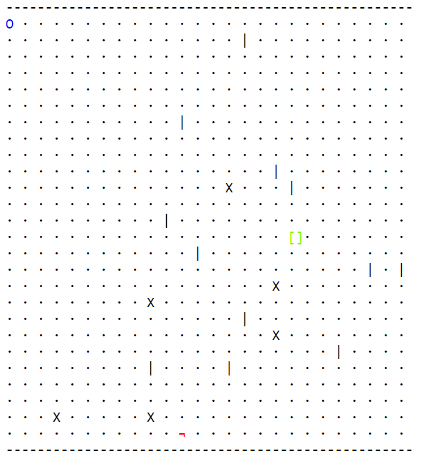 Tú eres un O (azul) y tienes que conseguir la llave ¬ (roja) evitando las X para entrar en la puerta [] (verde) y avanzar hasta la siguiente sala.