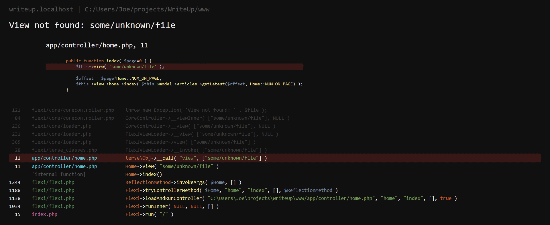 When an error strikes, the page is replaced with a full stack trace, syntax highlighting, and all displayed to be readable.