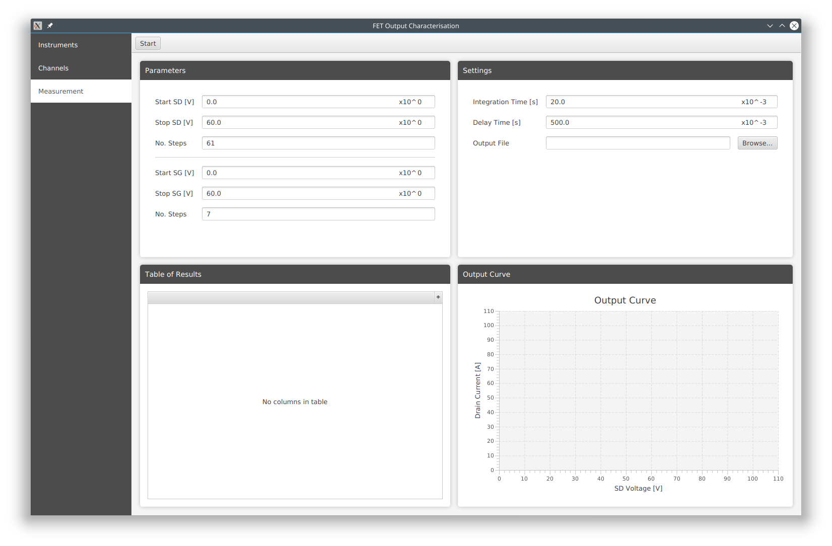 This add considerably to the previous examples, creating many GUI elements and combining them Grid objects and finally combining those Grid objects into a single Tabs object to act as the main window. This program offers the user means to change SMU connection and configuration options and displays both a plot and table of results