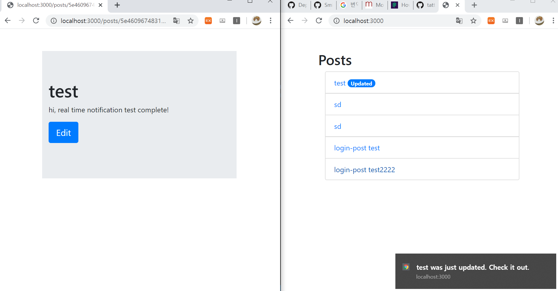 실시간 알림 테스트 Real time notification using pusher 알림 테스트 성공 화면 테스트 성공 화면- 푸쉬알림, 실시간 update 표시 (microsoft edge) 테스트 성공 화면- 푸쉬알림, 실시간 update 표시 (chrome) 참고자료 tutorials-realtime-noti - tutorial mongoose-docs 에러해결