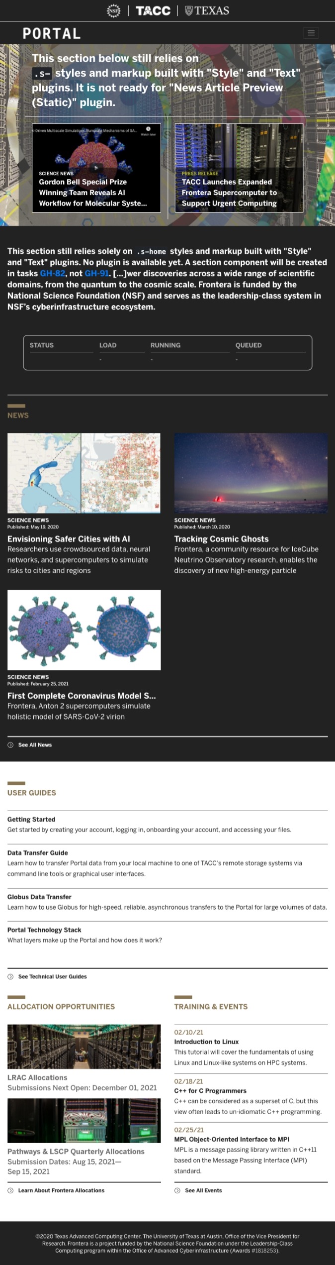 Convert Frontera Dev Homepage to Use New Article PluginsNotice: @tacc-wbomar already did this.