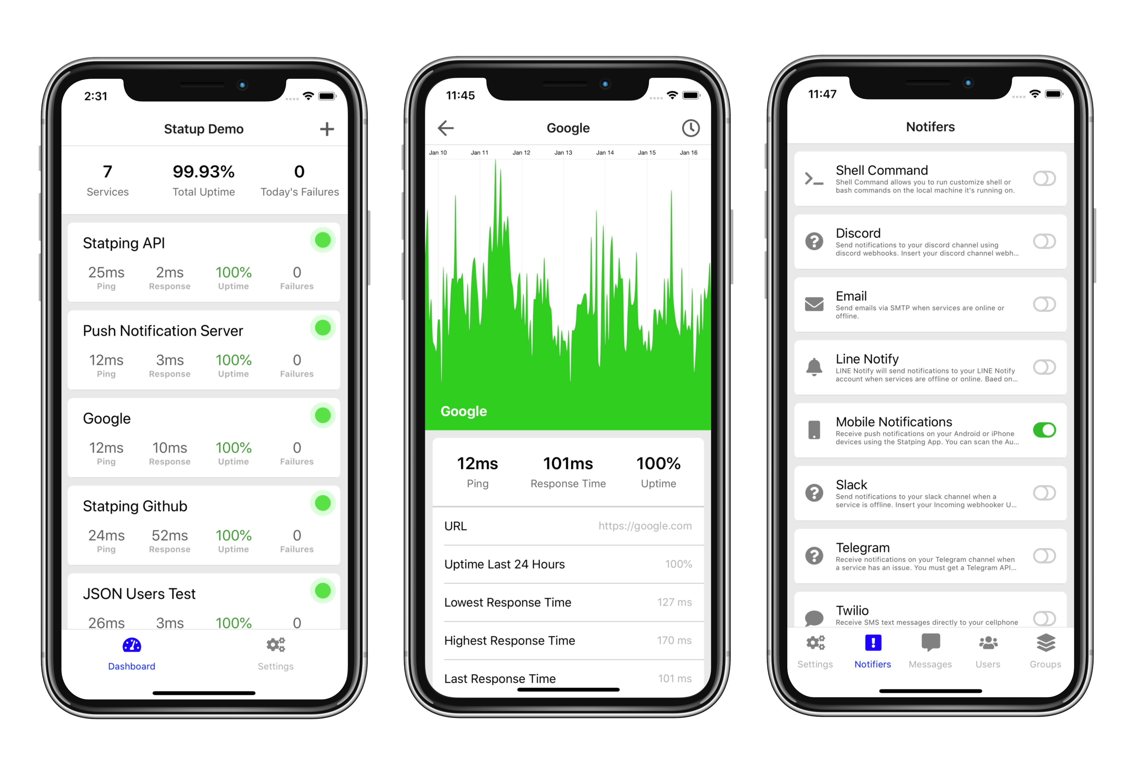 The Statping app is available on the App Store and Google Play for free. The app will allow you to view services, receive notifications when a service is offline, update groups, users, services, messages, and more! Start your own Statping server and then connect it to the app by scanning the QR code in settings.
