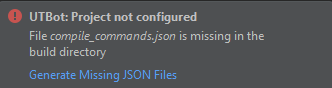 - "UTBot: Project not configured File compile_commands.json is missing in the build directory." — select Generate Missing JSON Files.