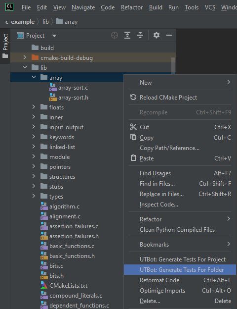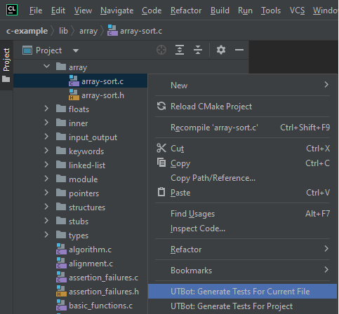 All these commands are available via Search Everywhere: go to Navigate > Search Everywhere and enter UTBot: Generate Tests.