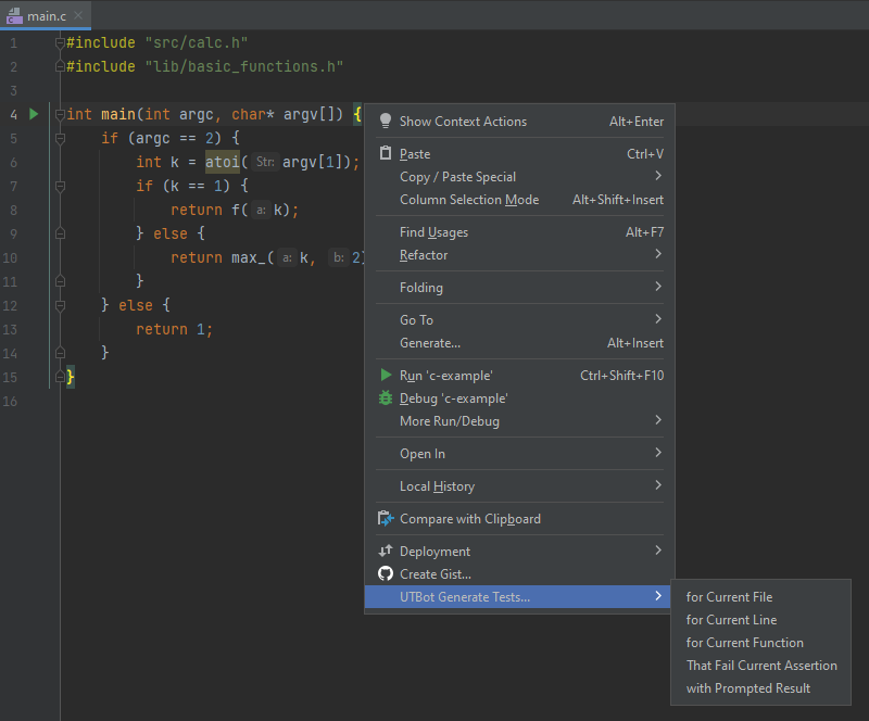 In the Editor, place the caret at the function body. Right-click, scroll down the menu, select UTBot Generate Tests... and choose the required option:
