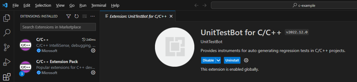 Now the UnitTestBot C/C++ plugin is displayed in File > Preferences > Extensions > Installed.