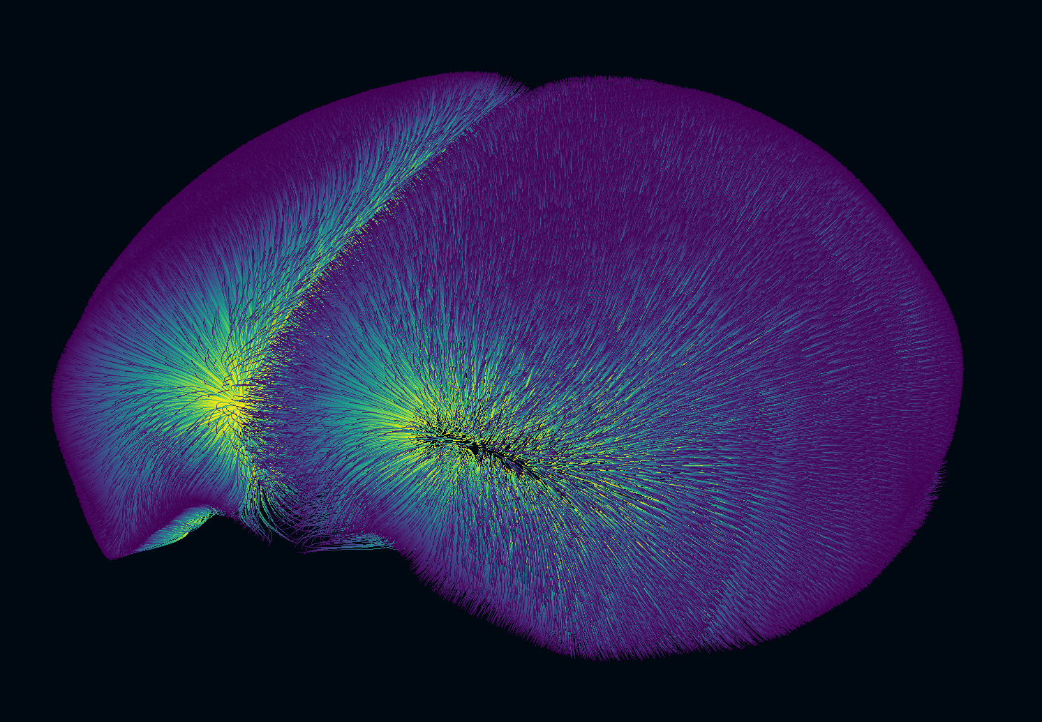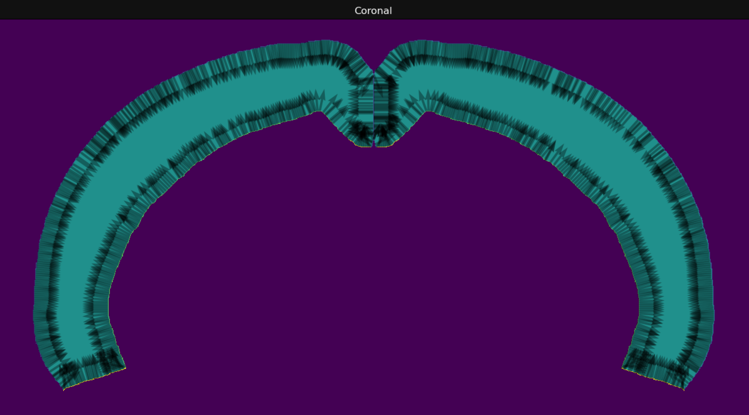 python surface.py. This script should create:regions/isocortex/mask.npy(a volume with labels indicating the surfaces and the regions between them)regions/isocortex/normal.npy(a 3D vector field with the surface normal vectors)