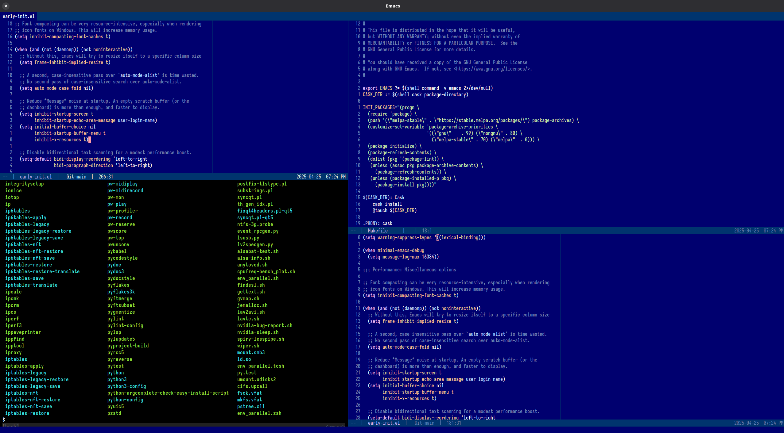 - Configures Emacs to avoid resizing frames and minimizes unnecessary UI updates.