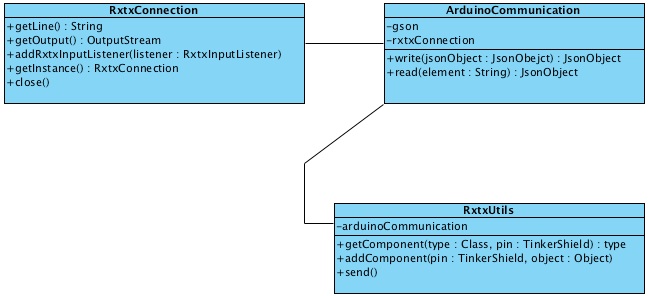 Dans cette bibliothèque, nous partons du principe que l’Arduino est relié à l'application Web par un port série via un câble USB. Puisqu'il nous fallait pouvoir écrire et lire des informations sur le port série, nous avons utilisé la bibliothèque RxTx. Mais cette bibliothèque est trop généraliste. Il a donc été nécessaire de créer notre propre ensemble de classes adaptées à notre cas spécifique. Cela signifie: