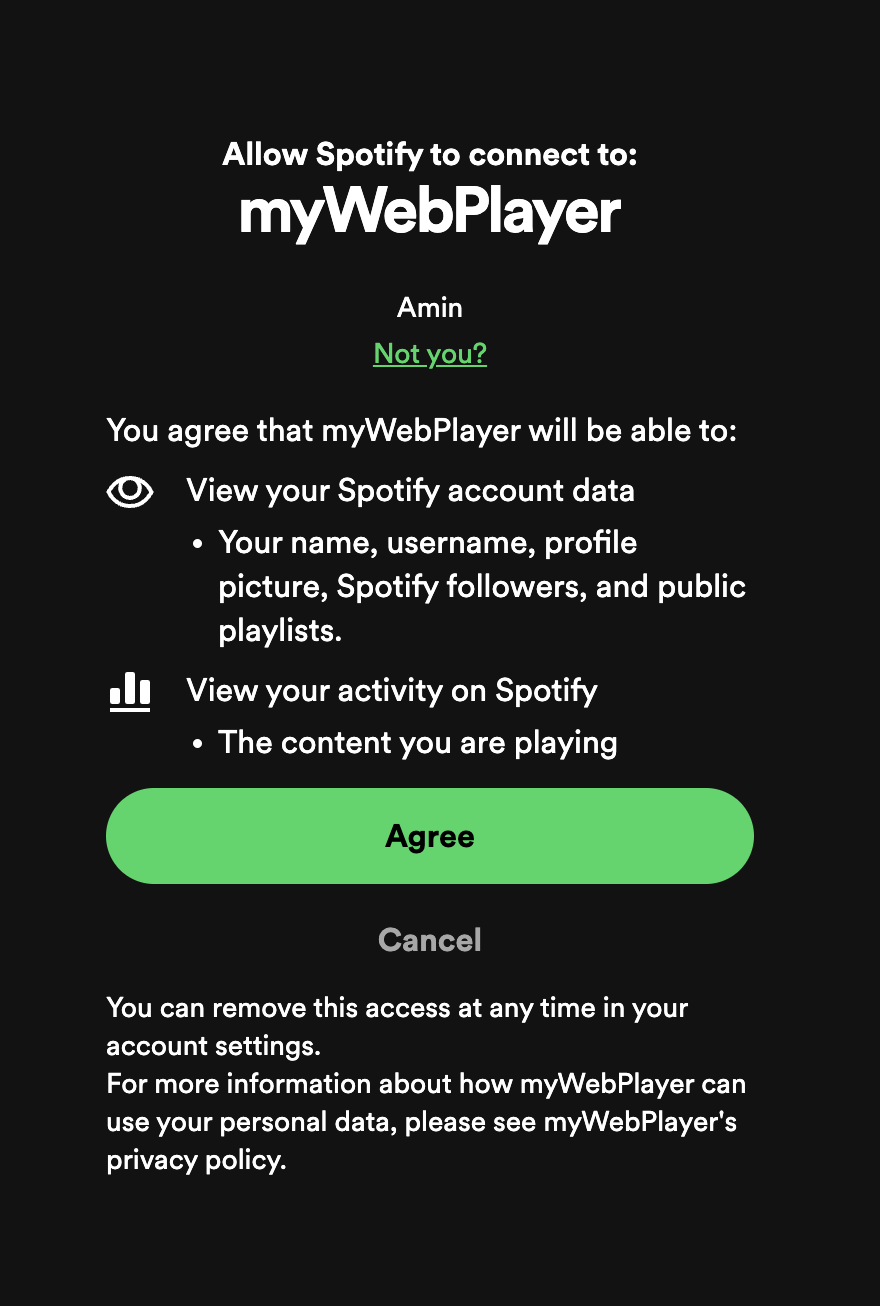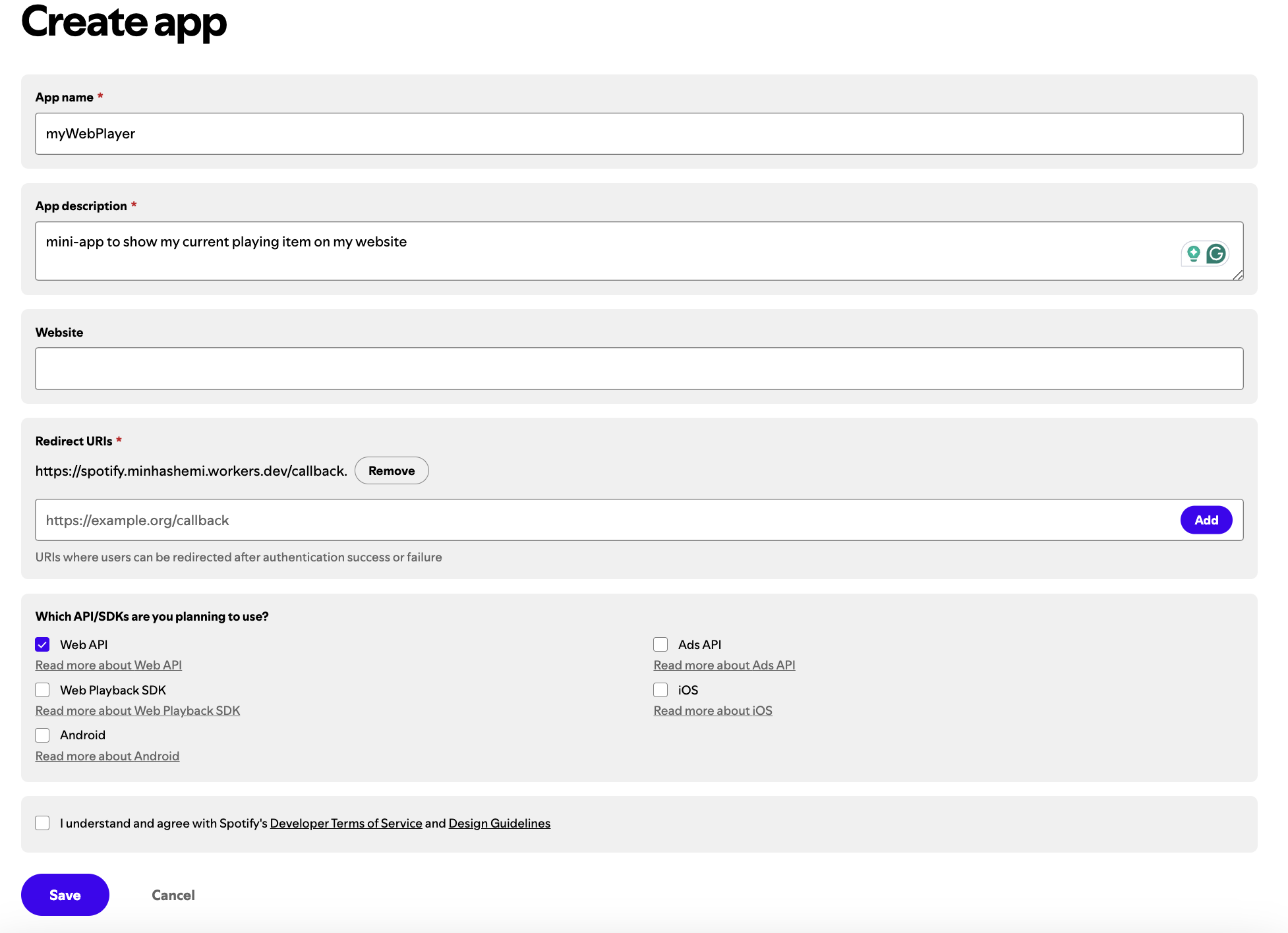myWebPlayer. (Note: Spotify doesn't allow apps to start with "spot".) - Add a description.