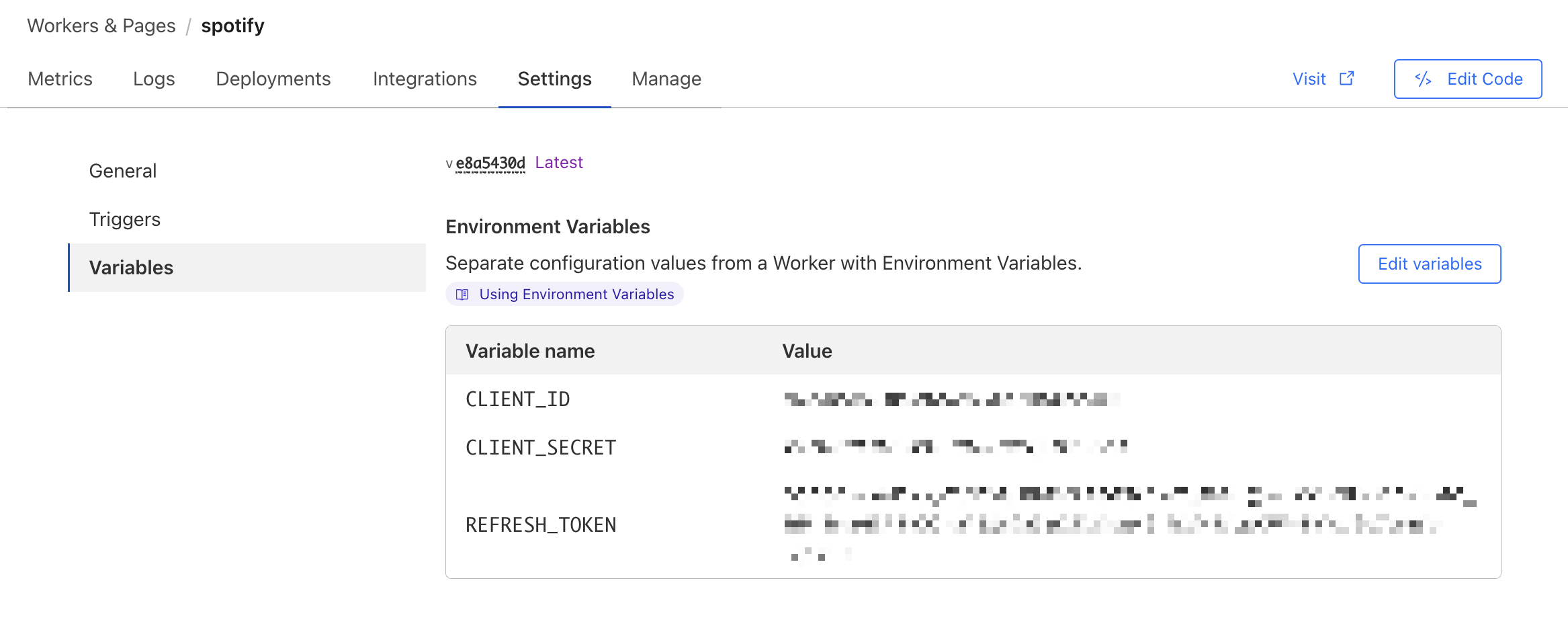 - In Cloudflare Worker settings, go to the Variables section.