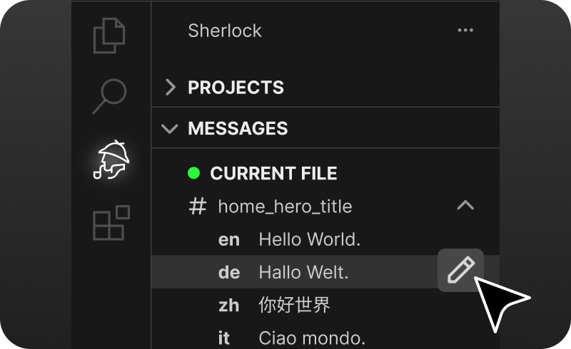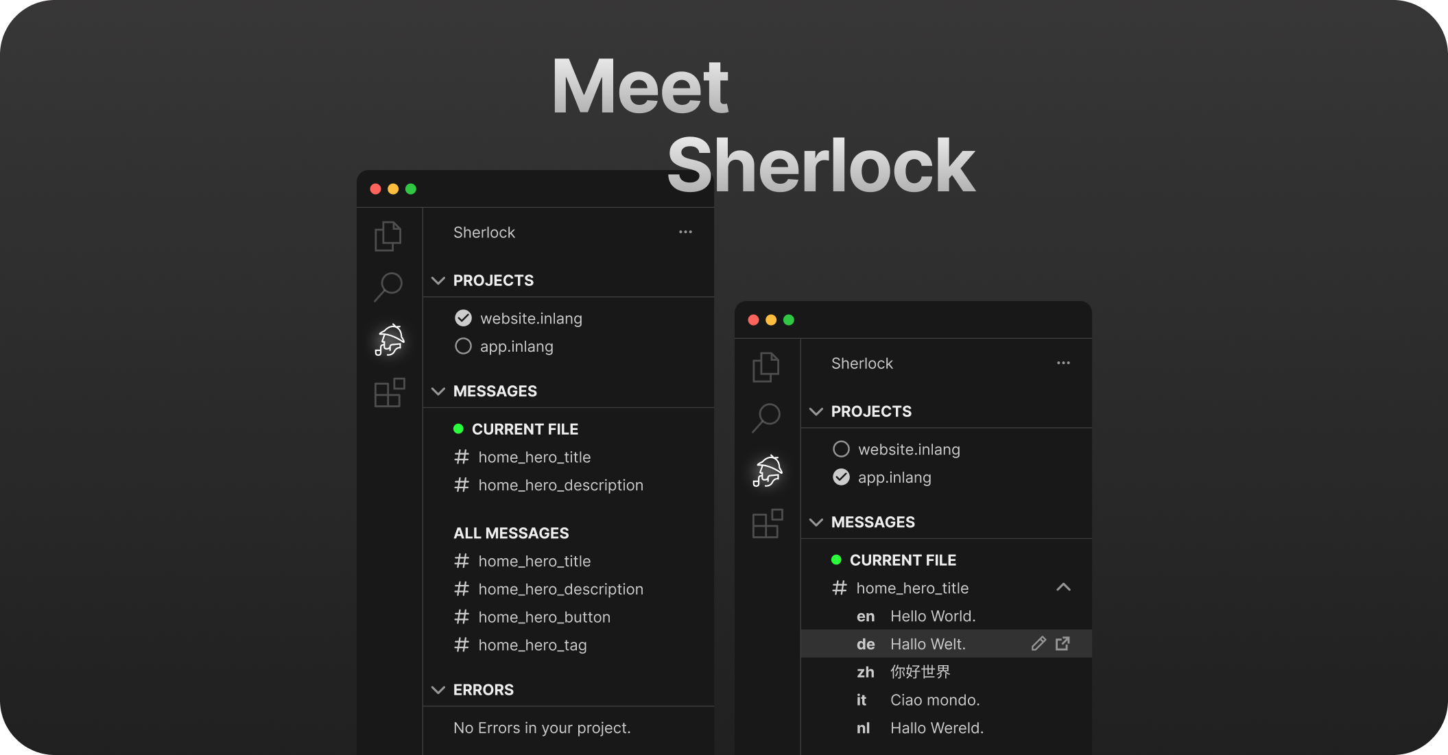 You can have multiple projects in your repository. By using the Sherlock tab, it's easy to switch between projects. Whenever you change the source text, translations from the resource files will be automatically updated. Additionally, the tab menu provides a quick overview of any project errors in the setup.