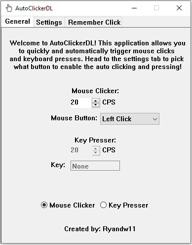 AutoClickerDL is a simple auto clicker created for computers using Windows. The application is coded in C and uses the WIN32 api directly.