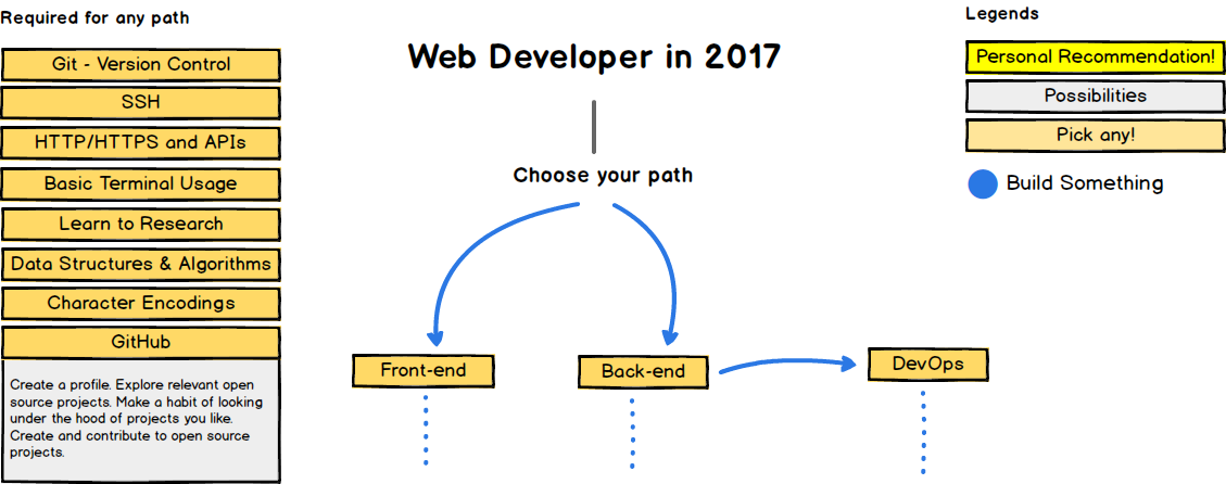 Below you find a set of charts demonstrating the paths that you can take and the technologies that you would want to adopt in order to become a frontend, backend or a devops. I made these charts for an old professor of mine who wanted something to share with his college students to give them a perspective.