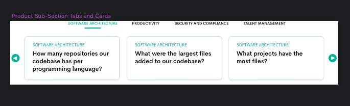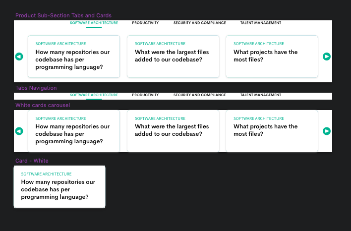 Here are the updated contents of the UI Pattern Library to include the new block of categories and cards to show source{d} Engine snippets on the Product page.