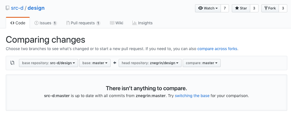 You should update your fork - .../znegrin/design.git - pulling from origin - .../src-d/design - if I'm not mistaken. |