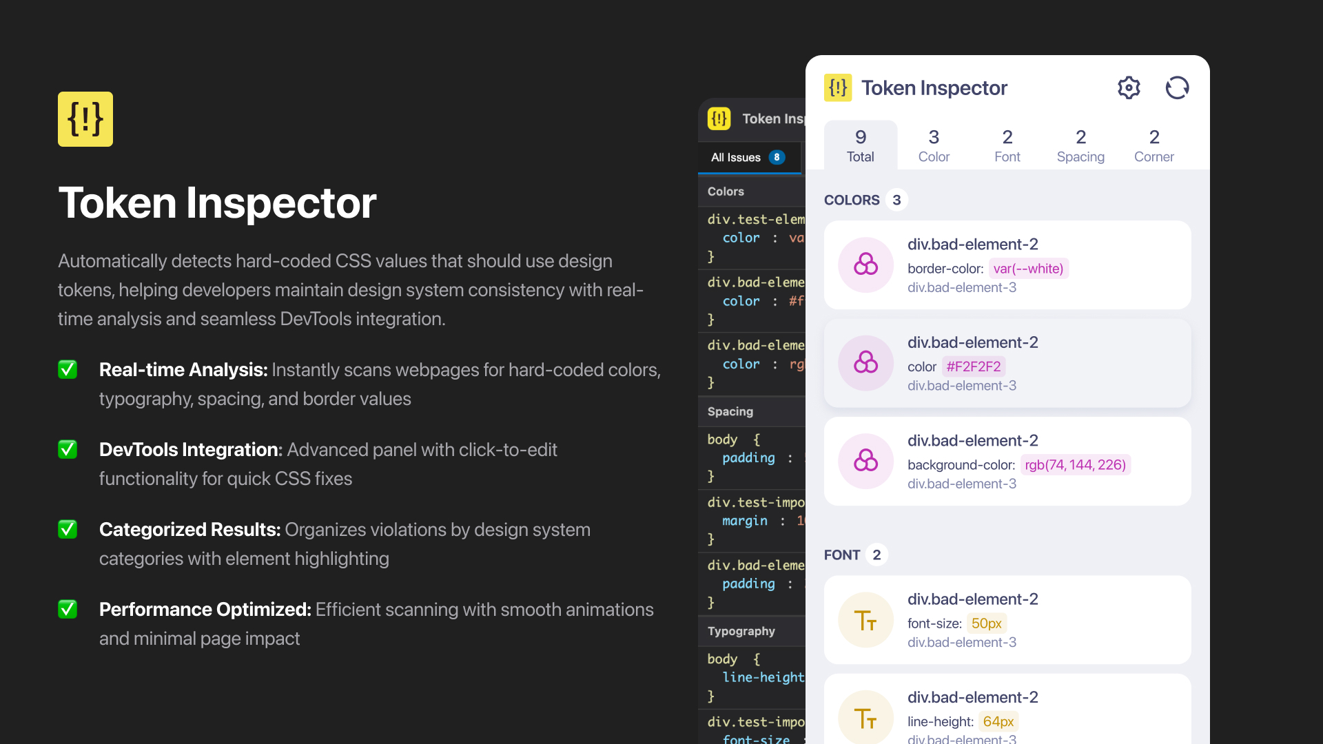 - Detects Hard-Coded CSS Values: Instantly scans webpages for hard-coded colors, typography, spacing, and border values that should use design tokens.