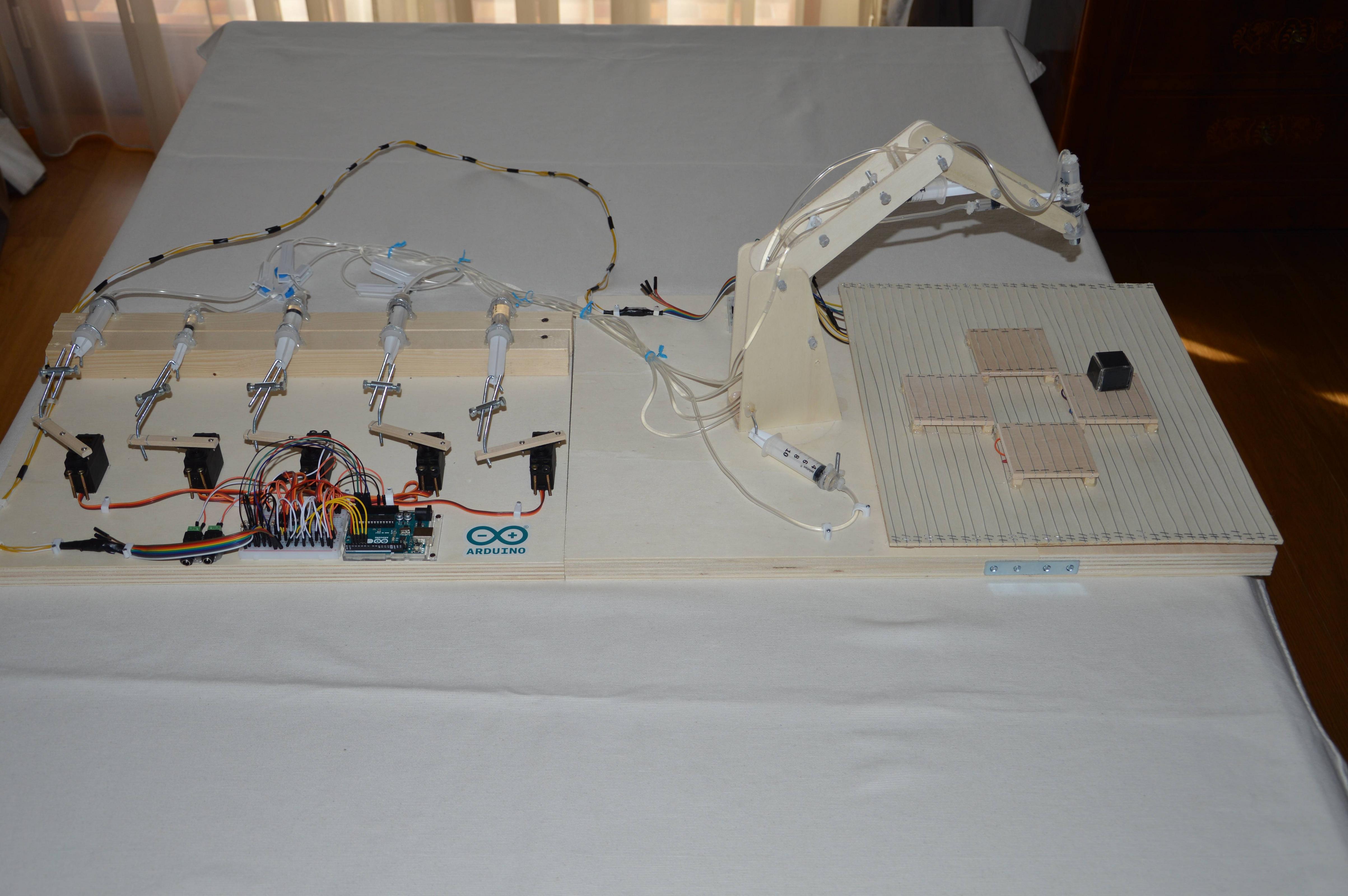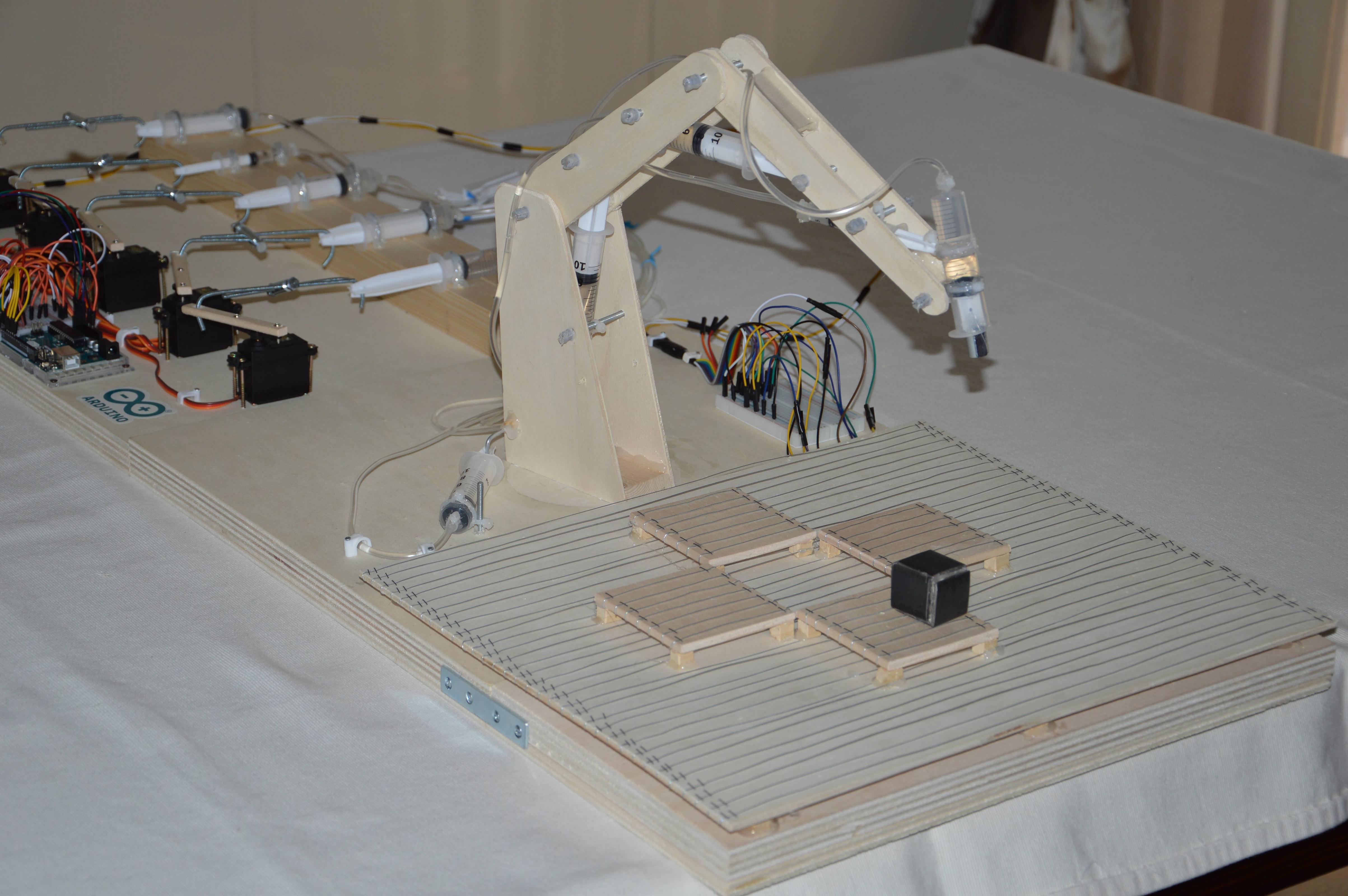 BAoBOS is powered by 5 servo-motors whose movement is handled by an Arduino-Uno board. Each servo motors pushed and pulls a syringe acting as a simple hydraulic piston. Syringes connected to the arm itself are thus extended or contracted.